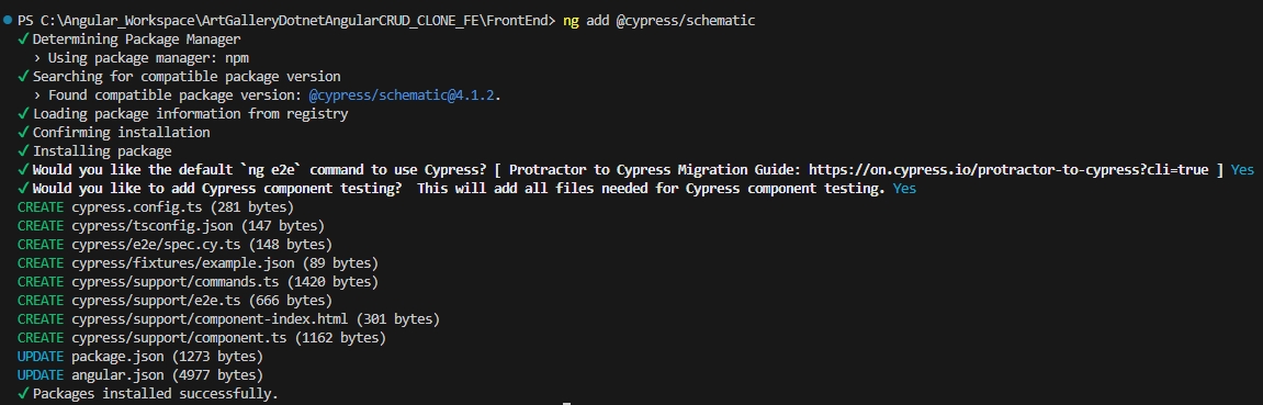 Voor Angular is er een schematic om Cypress te installeren. Een ander voordeel is dat Cypress officieel wordt ondersteund door Angular. Cypress is in een Angular applicatie te installeren en in te stellen met het commando: ng add @cypress/schematic