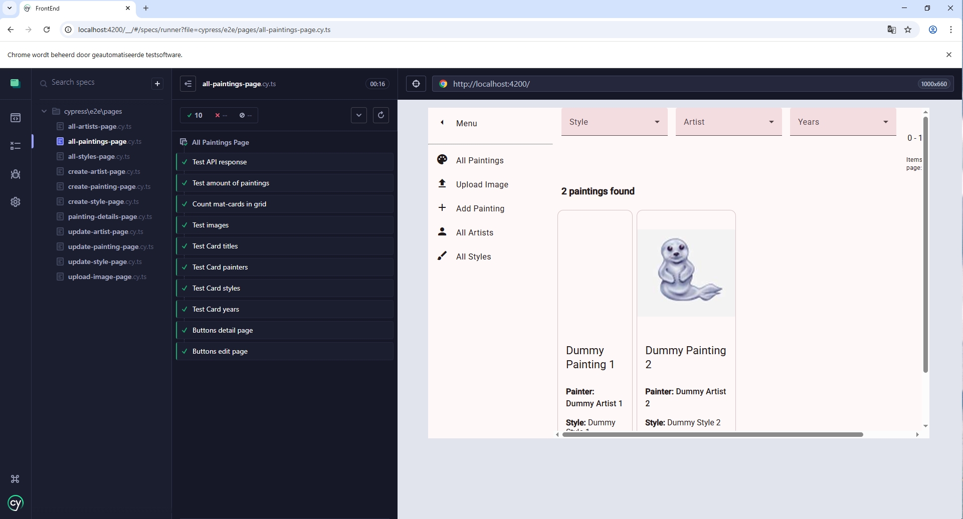 De User Interface met de testresultaten wijst zich zelf uit. Om zaken uit te testen met Cypress zijn er meer end-to-end tests geschreven dan noodzakelijk is. In de afbeelding hieronder zijn alle tests geslaagd en hebben deze een groene kleur. Wanneer een test mislukt dan is deze rood. In dit voorbeeld is er gebruik gemaakt van een ‘fake-API’.